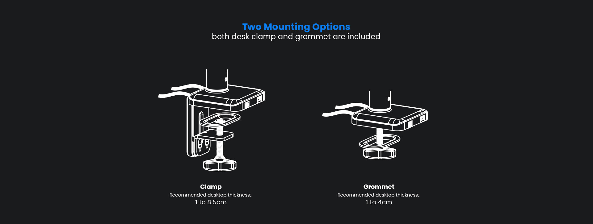 • Suggested Desktop Thickness: Clamp: 10~85mm (0.39"~3.3"), Grommet: 10~40mm (0.39"~1.6")
