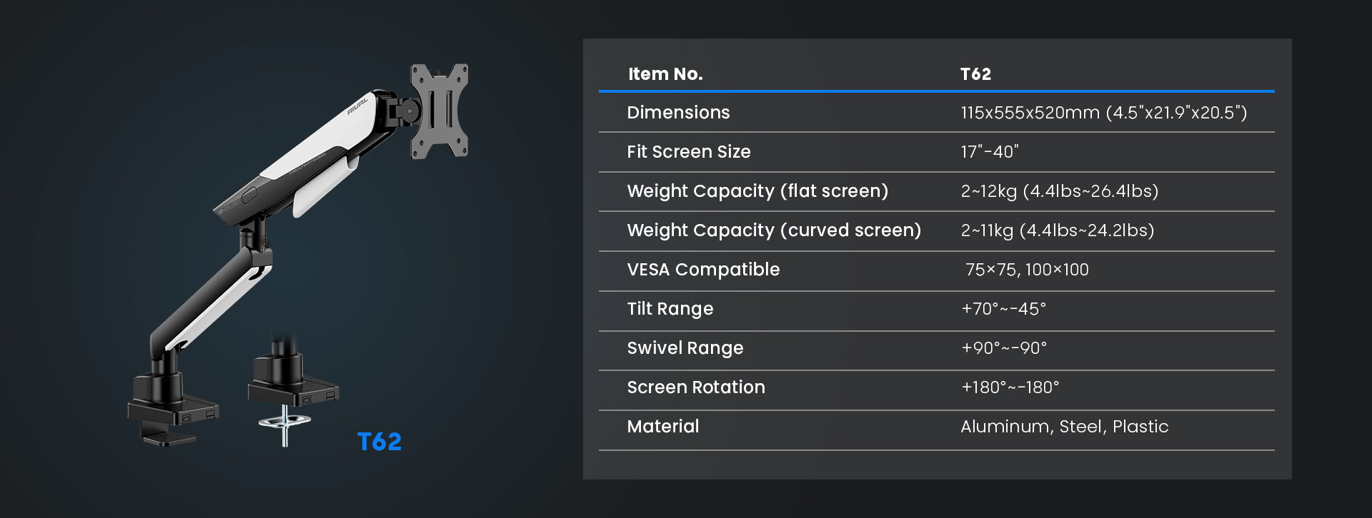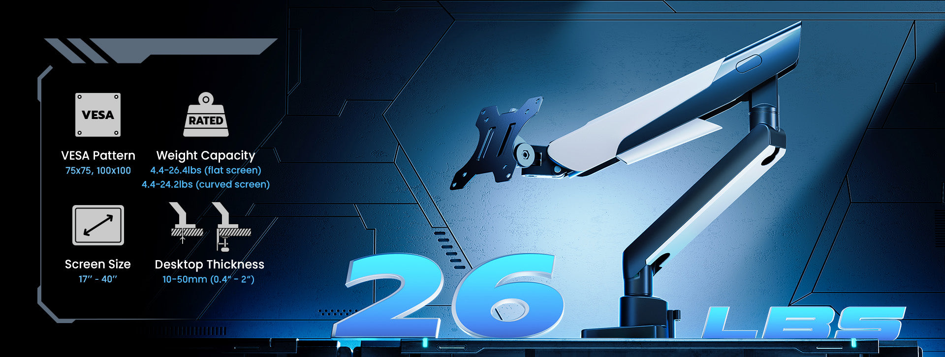 Fits 17” to 40” Screens: Fits most screens 17” to 40” in size and up to 12kg in weight with VESA 75x75mm or 100x100mm hole patterns. Recommended desktop thickness ranges from 1 to 5cm.