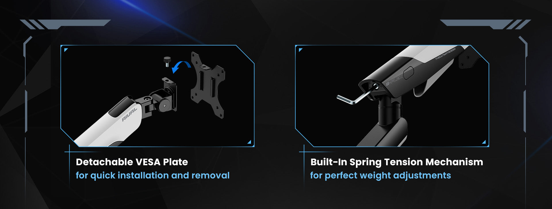 - Detachable VESA plate and quick-release joint for effortless assembly.