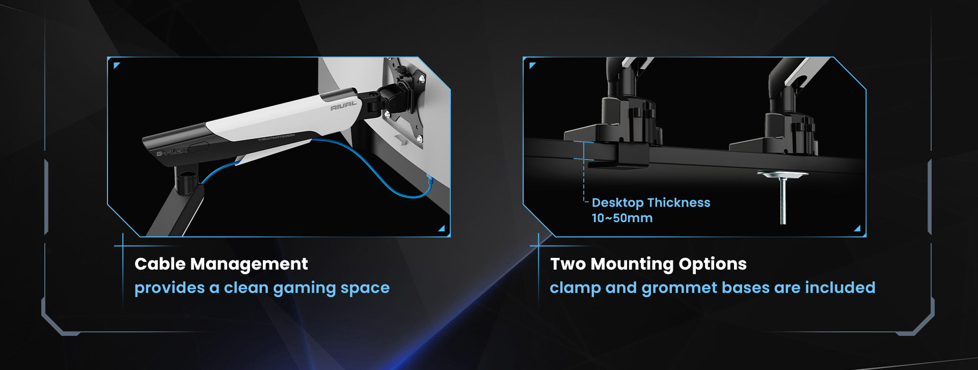 - Suggested Desktop Thickness: Clamp: 10 - 50 mm (0.39" - 2"), Grommet: 10 - 50 mm (0.39" - 2")