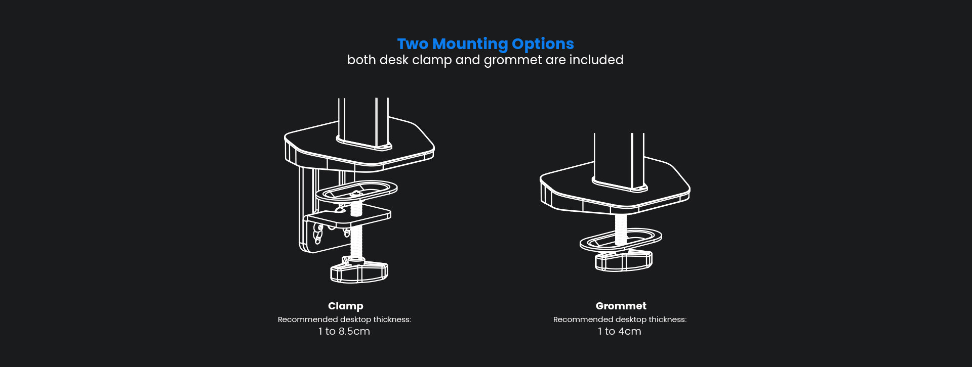 - Suggested Desktop Thickness: Clamp: 10-85mm, Grommet: 10-40mm (Clamp: 0.39"-3.3", Grommet: 0.39"-1.6")