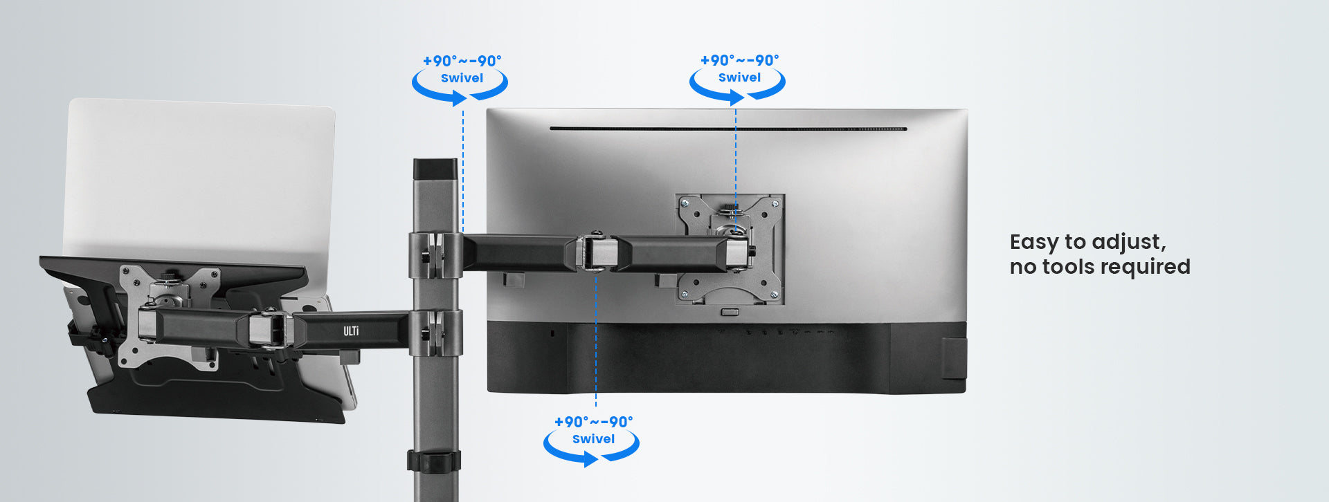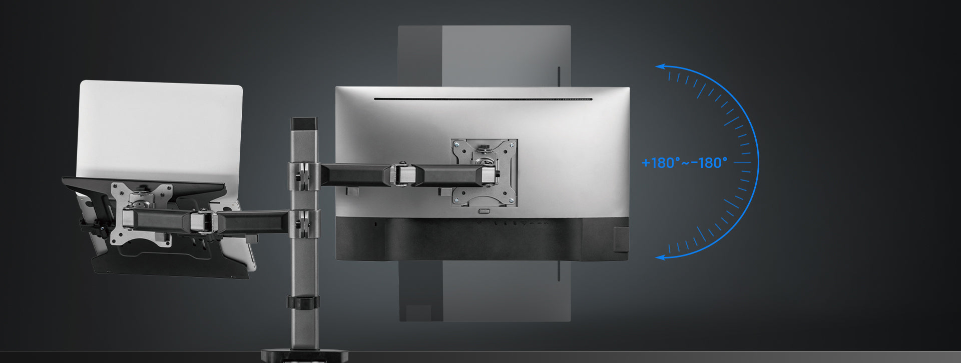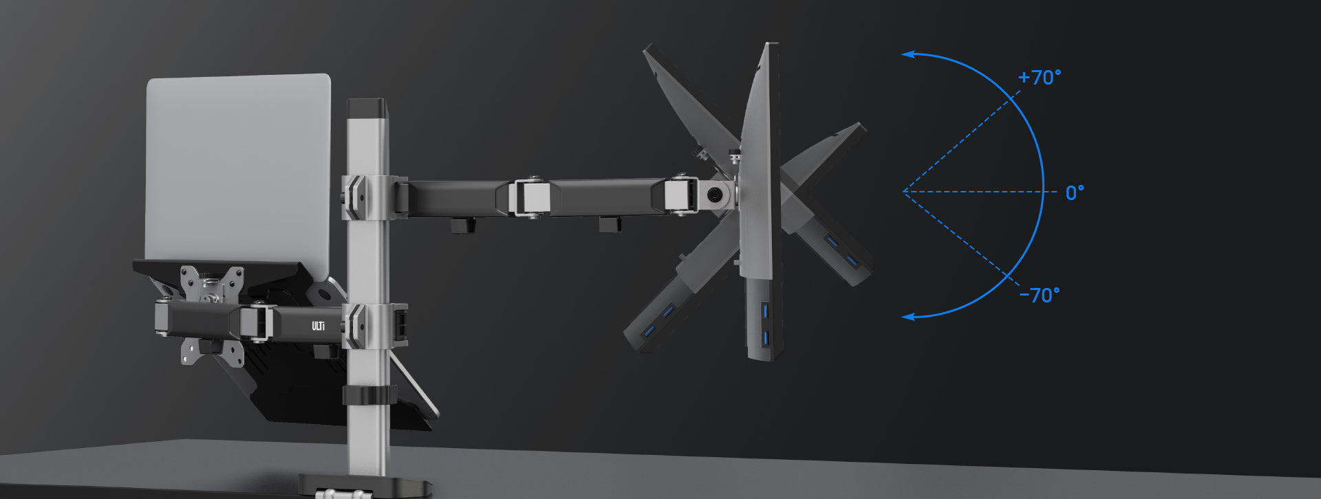 Articulation & Height Adjustment: Enjoy comfortable viewing angles with +70° to -70° tilt, 180° swivel, 360° rotation, and height adjustment along the center pole. Monitors can be placed in portrait or landscape orientation.