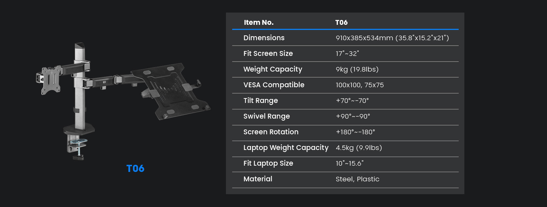 Wonderful combination of a laptop tray and monitor arms: Perfect for the user who is used to working on a PC and a laptop at the same time. (Model T06)